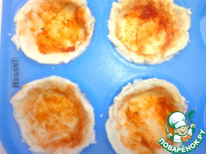 Заполняем форму для кексов нашей основой для мини-пиццы, смазываем ее томатным соусом.