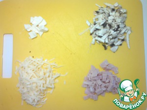 Подготавливаем начинку: режем ветчину, сосиски, натираем сыр, очищаем и режем грибы.
