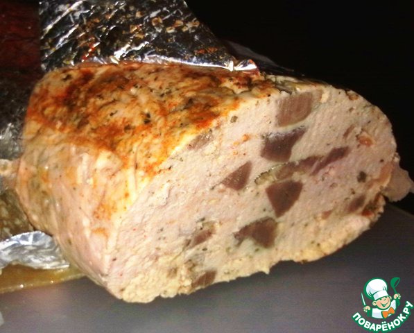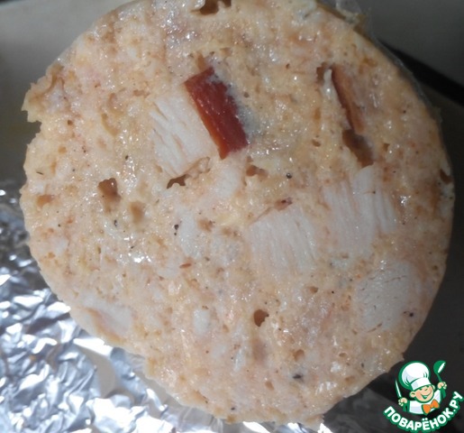 Расстилаем фольгу, формируем из фарша колбаску-батон, сверху можно ещё посыпать специями (по желанию).