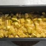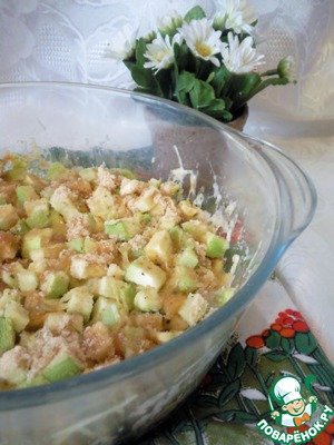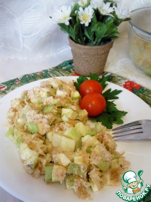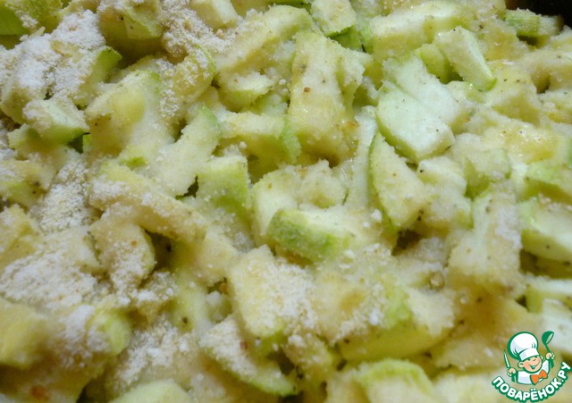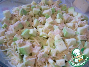 Форму, в которой будем запекать, смазываем небольшим количеством сливочного масла (я, кстати, пару раз забывала это сделать - ничего не пристало, и результат от этого хуже не стал). Нарезанные кабачки солим-перчим по вкусу, добавляем любимые травки-специи и хорошо перемешиваем с сыром.