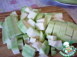 Кабачки помыть и почистить, если они очень молоденькие, то можно и не очищать, а сразу нарезать кубиками примерно 1-1,5 см.