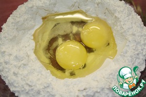 Насыпать муку в отдельную чашку, сделать углубление.