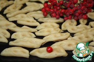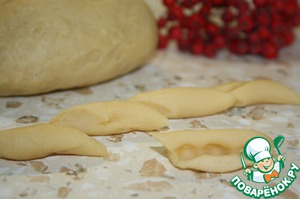 Затем от теста отрезаем кусочек, катаем "колбаску", делим ее наискосок на несколько частей по 2-3 см. Теперь на кусочек ставим пальцы, придавливаем и немного прокатываем на себя, чтобы получились ложбинки. Так поступаем с каждым кусочком.