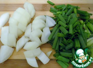 Лук хорошо помыть и обсушить. Нарезать зеленый и репчатый лук. Можно не мельчить, это нам нужно всего лишь для удобства и быстроты.