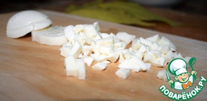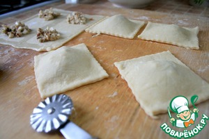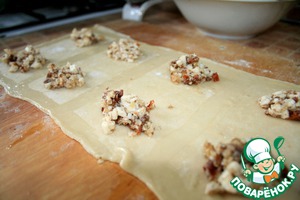• Раскатать тонко тесто. Чайной ложкой выложить начинку (на расстоянии 4 см друг от друга). Между начинкой тесто смазать белком.