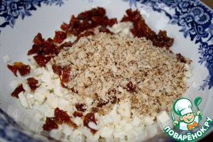 • К сыру и помидорам добавить орехи. Всё перемешать.