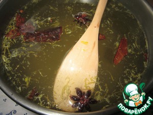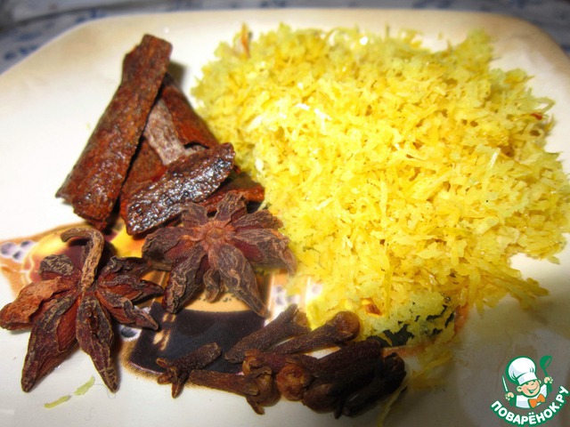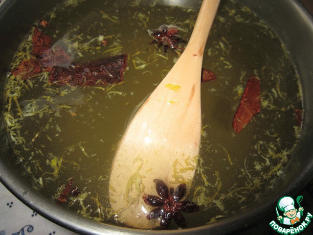 Цедру и специи добавить к водке и дать настоятся, после этого корицу и бадьян вытащить.