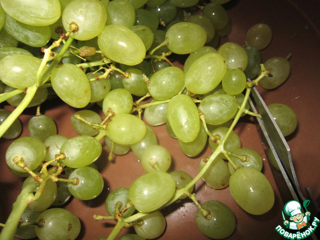 Пока напиток настаивается, подготовим виноград. Еще раз его промываем и отрезаем ножницами каждую виноградинку, оставляя хвостики около 5 мм.