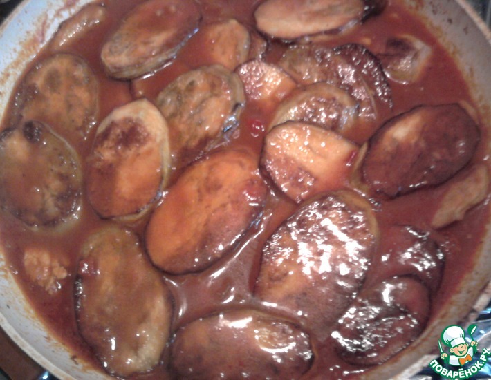 Когда мясо будет готово, выложить сверху баклажаны и тушить еще 20-30 минут ( обязательно попробуйте на соль - баклажаны заберут соль из соуса).