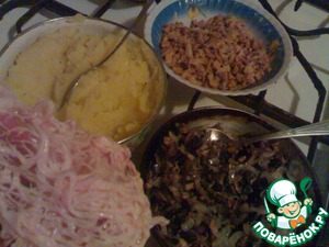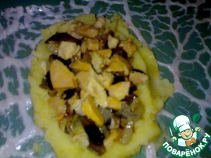 Выложить картофель в виде котлеты. Сверху положить мясо, грибы с луком, и снова - мясо и картофель.