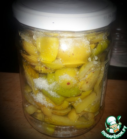 Теперь укладываем ломтики айвы в банку, каждый слой пересыпая сахаром (примерно по 1-1.5 ч. л.)