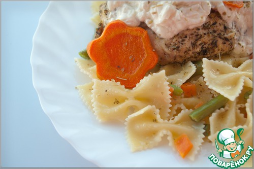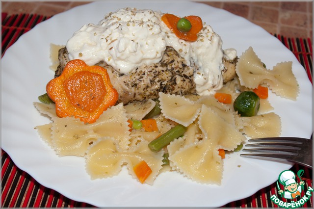 Подавайте грудки с фарфалле и шапочкой из сливочного соуса.