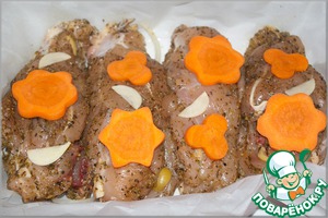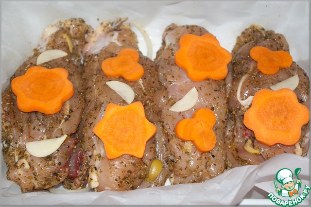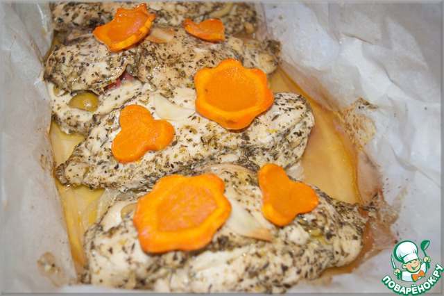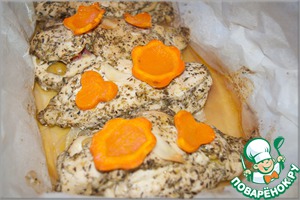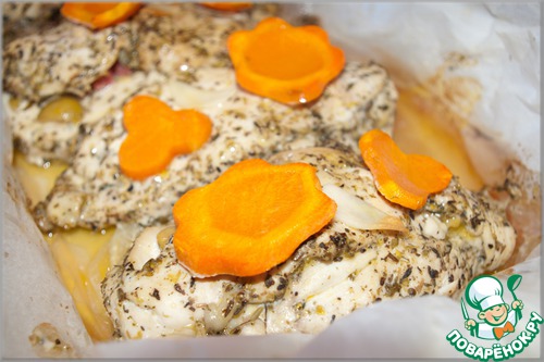 Добавьте сверху морковь (я вырезала формочкой для печенья фигурки) и чеснок. Закройте (не приминая сильно) сверху пергаментом и поставьте грудки в духовку на 45 минут при температуре 180 градусов.
