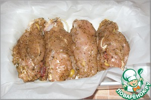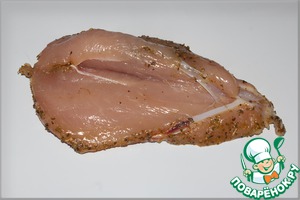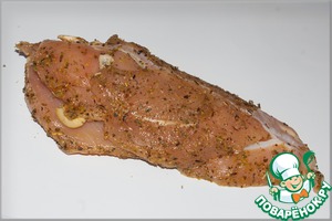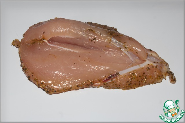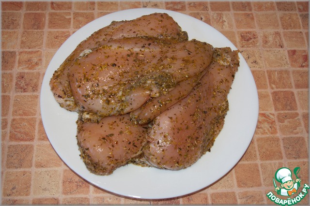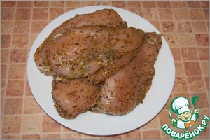 Куриные грудки, филе, посолить, поперчить и замариновать в оливковом масле и пряных травах - орегано, розмарин, базилик, чабер. Можно использовать готовую смесь. Оставить грудки мариноваться на минут 20. Если у вас есть время, то можно оставить на побольше.