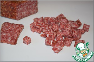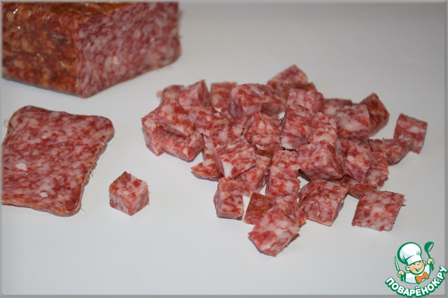 Сыровяленую колбасу нарезать кубиками. В идеале, лучше взять салями - вкусную, ароматную, со специями.