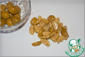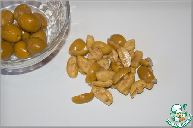 Зеленые оливки без косточек (у меня фаршированные лимоном) разрезать на четвертинки.