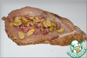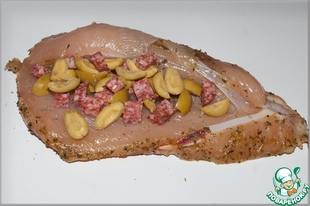 Посолить, поперчить, добавить щепотку трав и нафаршировать грудку колбасой и оливками.