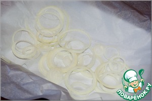 Форму для выпекания выстелить пергаментом. Натурально и безопасно. На дно выложить колечки лука.