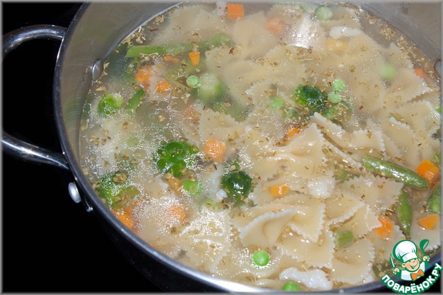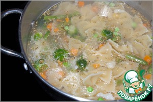 Фарфалле засыпать в кипящую воду, добавить соль, пряные травы, оливковое масло и варить 10-12 минут. За 7 минут до готовности добавьте в кастрюлю овощи и помешайте. Варите бабочек с овощами, помешивая.