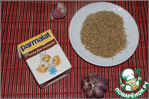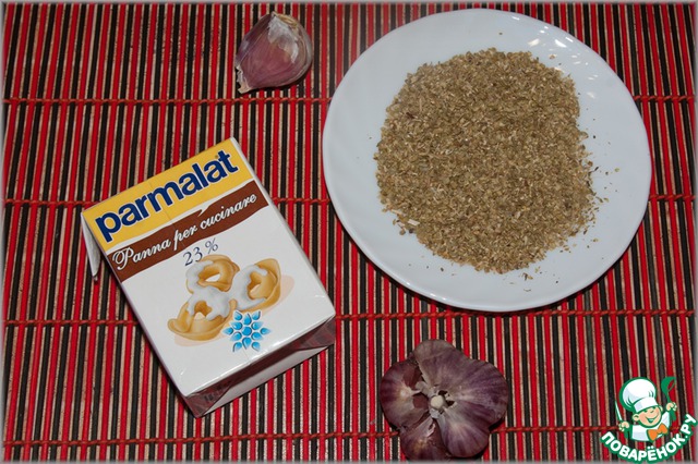 Теперь приготовим сливочно-чесночный соус. Для этого нам понадобятся сливки 23% (или 33%), пряные травы, соль, черный перец, щепотка молотого мускатного ореха и, конечно, чеснок. Если есть возможность, используйте сливки Parmalat - они чудесно взбиваются.