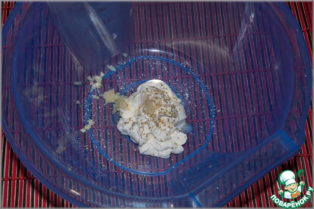 Итак, в чашку поместить сливки, посолить, добавить пряных трав, щепотку мускатного ореха и давленный через пресс чеснок.
