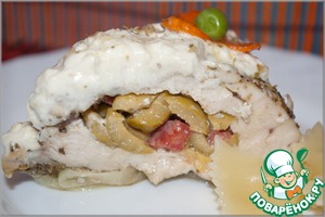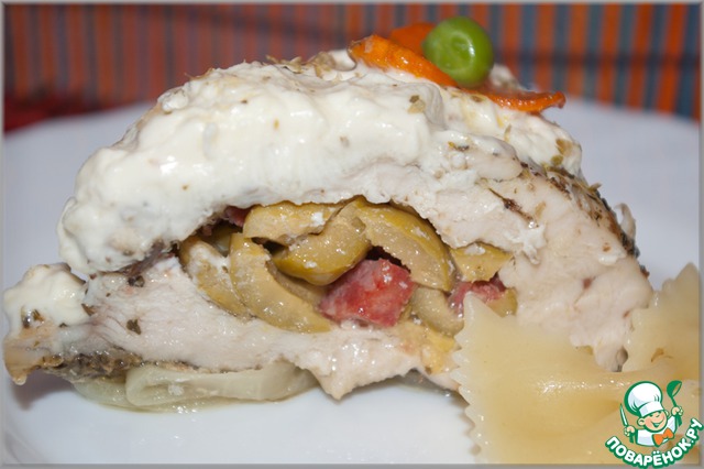 Нежнейшая куриная грудка, фаршированная оливками и сырокопченой колбасой, под чесночно-сливочной шапочкой. Просто тает во рту!