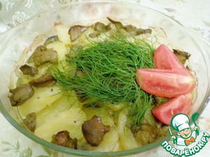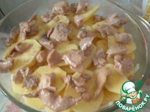 Завершает все еще один слой картошки, на которую выкладываем кусочки печени трески. И, заключительный аккорд - поливаем все маслом от трески. Накрываем крышкой и ставим запекаться в разогретую духовку при 200 градусах 30 минут. Ориентируемся на готовность картошки.