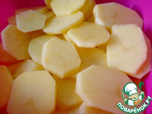 Картофель почистить, опять же помыть и нарезать ломтиками.