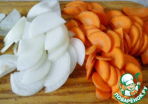 Те же процедуры (чистим-моем) проводим с луком и морковью, а затем режем кольцами-полукольцами, как кому больше нравится.