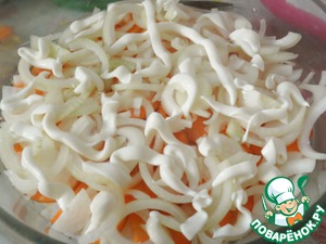 Дальше идет лук, на который выкладываем немного майонеза (без последнего можно и обойтись, но с ним сочнее).