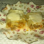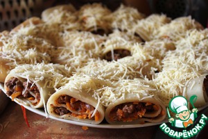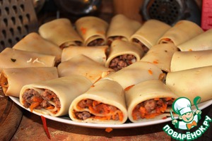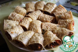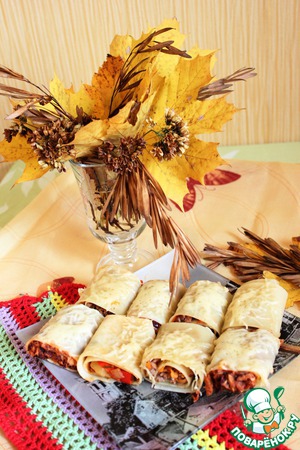 На каждый лист распределяем начинку тонким слоем (примерно по 1-2 ст. л. на лист). И закручиваем лист рулетиком.