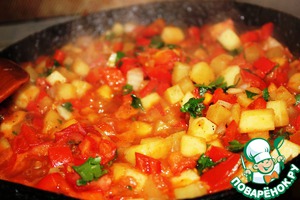 Готовим овощную начинку. Мелко режем цуккини, перец, лук и зелень. Обжариваем овощи на сковороде около 7 минут, добавляем протертые томаты, зелень и тушим еще 5 минут. Солим, перчим по вкусу. Выключаем, отставляем в сторону.