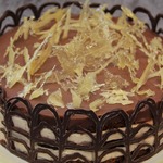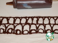 На ленте из пекарской бумаги, длина которой соответствует объёму торта, а ширина его высоте + 2 см начинаем рисовать чёрным растопленным шоколадом 125 г. Дать шоколаду застыть и обвернуть ленту вокруг торта и плотно прижать. |