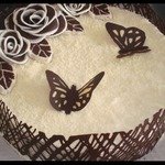 На ленте из пекарской бумаги, длина которой соответствует объёму торта, а ширина его высоте + 2 см начинаем рисовать чёрным растопленным шоколадом 125 г. Дать шоколаду застыть и обвернуть ленту вокруг торта и плотно прижать. |