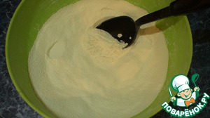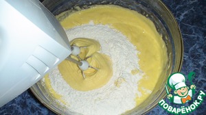 • Вводим постепенно в яично-масляную смесь просеянную муку с разрыхлителем.