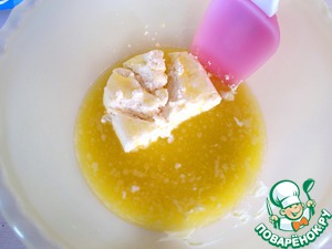 Начнём с того, что растопим сливочное масло, чуть остудим и соединим с творогом. -
