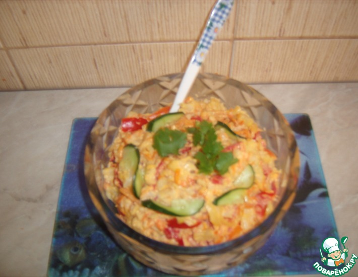 Соединить все ингредиенты, добавить чеснок, заправить майонезом и салатик "от шефа " готов. Я уверена, что он вам понравится. Приятного аппетита!!!