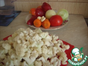 Капусту разобрать на соцветия, почистить лук, морковь, перец, чеснок.