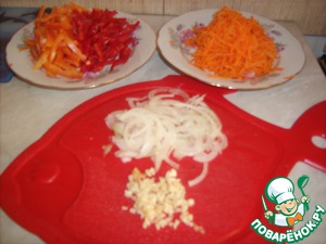 Морковь натереть на крупной тёрке, лук и перец нарезать полукольцами, чеснок измельчить.