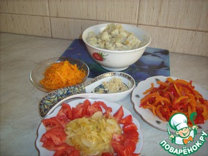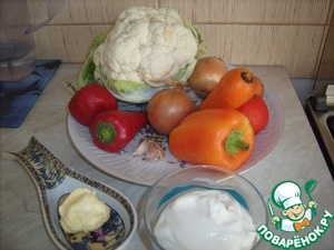 Приготовить указанные ингредиенты (капуста цветная, красный болгарский перец, морковь, лук, чеснок, майонез, сливочное масло.