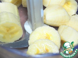 Банан порезать на кусочки, добавить смесь сливки + белый шоколад, взбить до однородной массы в блендере.