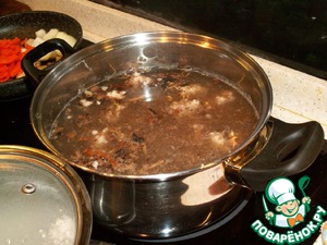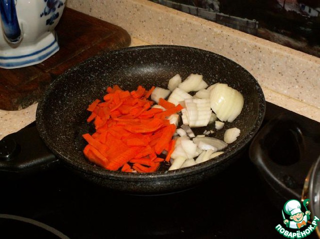 Пока бульон готовится, сделать пассеровку на растительном масле из моркови и лука. К супу добавить картофель, пассеровку.