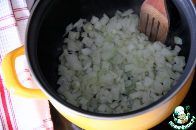 Итак, приступим... Очистить лук и чеснок, мелко их нарезать и пассеровать в 2 ст. л. оливкового масла на умеренном огне, помешивая, до прозрачности.