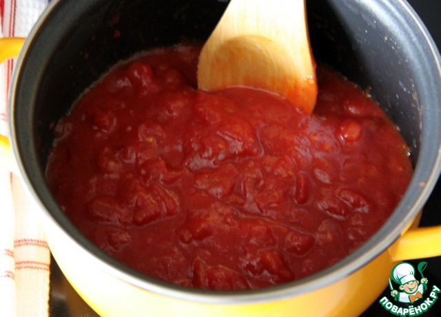 Затем добавить консервированные томаты в собственном соку, нарезанные кубиками (например, от POMITO), и оставить тушить наш соус на небольшом огне 30 мин. Кастрюлю крышкой не закрывать! Жидкость должна испаряться и соус должен загустевать. Периодически помешивать.