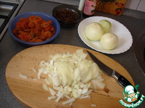 Лук очистить, нарезать кубиками, опустить в казан, в котором уже достаточно хорошо прогрелось кунжутное масло. Если вы готовите это блюдо из дичи, то использование кунжутного масла считается обязательным условием. Масло в сочетании с рисом и урюком помогает устранить специфический запах дичи и придать блюду характерный национальный вкус.