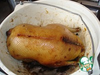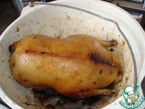 На медленном огне обжариваете утку до темно-золотистого цвета со всех сторон в течение 20-30минут, добавляете 1,5ст воды и продолжаете тушить на медленном огне, периодически поливая её соком и переворачивая с боку на бок.