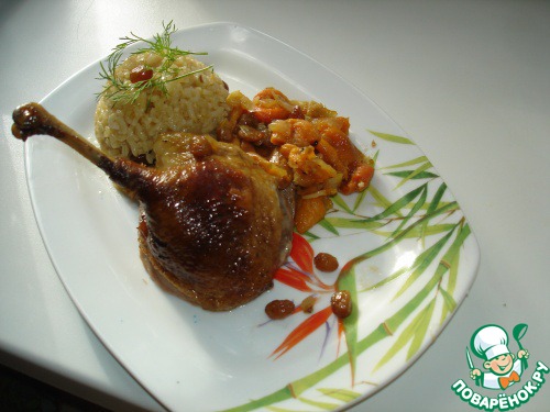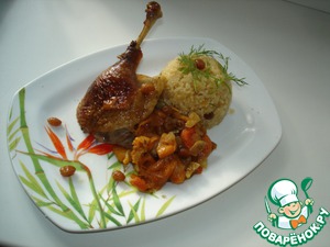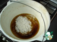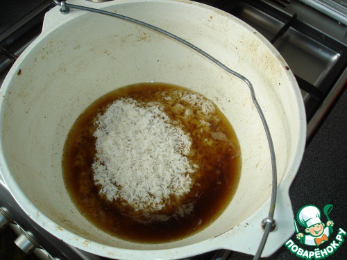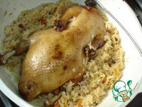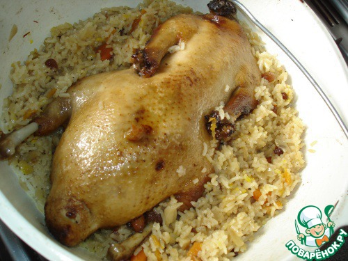 В сок, который остался от обжаривания утки, выкладываете рис и остатки начинки. Добавляете 2стакана кипящей воды, накрываете крышкой и доводите рис, на самом малом огне, до готовности.