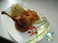 При сервировке птицу разрезают на порционные куски, а рис и начинку гарнируют, не смешивая, по разные стороны тарелки.