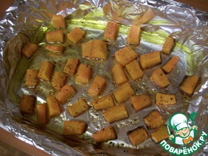 Нарезать тыкву на небольшие ломтики, выложить в противень, полить четырьмя столовыми ложками масла, посолить, поперчить и поставить в разогретую до 200 градусов духовку на 15 минут.