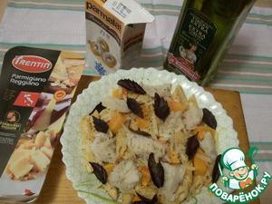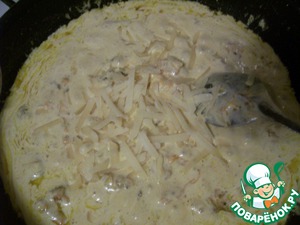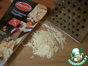 Перемешиваем, добавляем тертый пармезан, солим и перчим по вкусу.